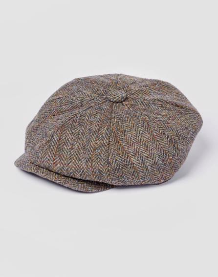 Men's 8-piece newsboy caps in genuine Harris tweed or cotton moleskin. Classic fabrics in a classic British style.